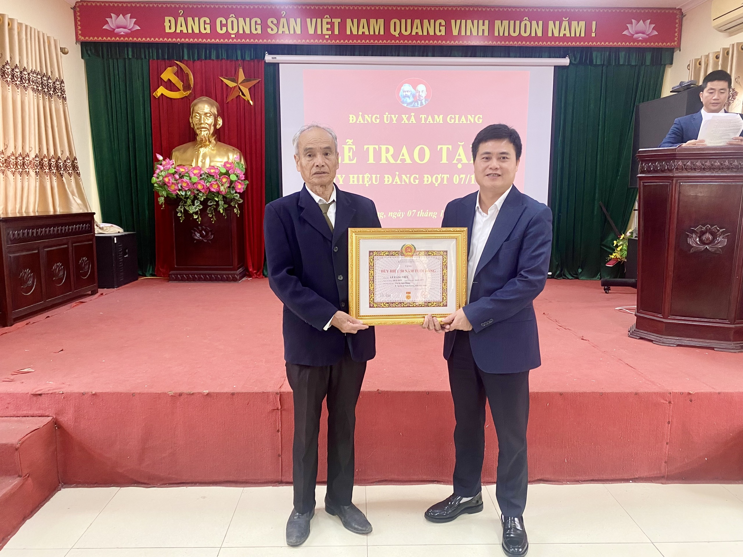Trong đợt 7/11 năm nay, Đảng bộ xã Tam Giang có 11 đảng viên được trao tặng Huy hiệu Đảng. Trong đó, có 02 đồng chí nhận Huy hiệu 60 năm tuổi Đảng, 01 đồng chí nhận Huy hiệu 50 năm, 01 đồng chí nhận Huy hiệu 45 năm, 04 đồng chí nhận Huy hiệu 40 năm và 03 đồng chí nhận Huy hiệu 30 năm tuổi Đảng.